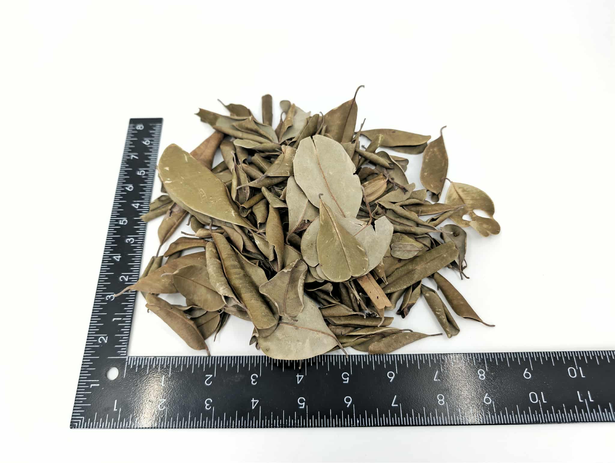 This natural botanical mix contains small to medium Palu leaves and pieces generally ranging from approximately 1–3 inches in size, as shown in the photo with ruler reference. The variation in shapes and curled leaves creates excellent texture when layered across substrate, producing a realistic tropical leaf litter layer.