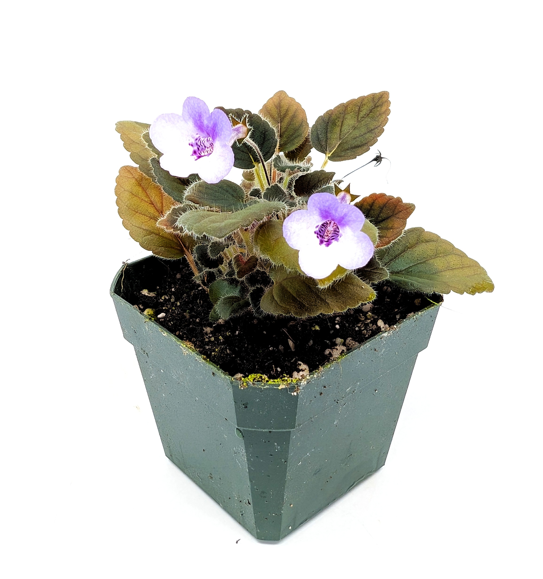 General Information and Care: Sinningia 'Freckles' is one of a handful of micro-mini plants that we offer. To get this notation, the leaves all stay under 1" even when completely mature. The overall plant may grow to be several inches in diameter, but this is only due to its mounding tendencies. This species prefers medium to high light, and medium to high moisture. It has shown an ability to be grown both epiphytically or terrestrial, and does not seem to show a preference to one or the other. This species has light purple and white flowers with some purple speckling in the white areas. Additionally, the leaves on this species are dark green to almost purple under certain lighting conditions. This species seems to be easiest to propagate through tip cuttings which root and flower very easily.